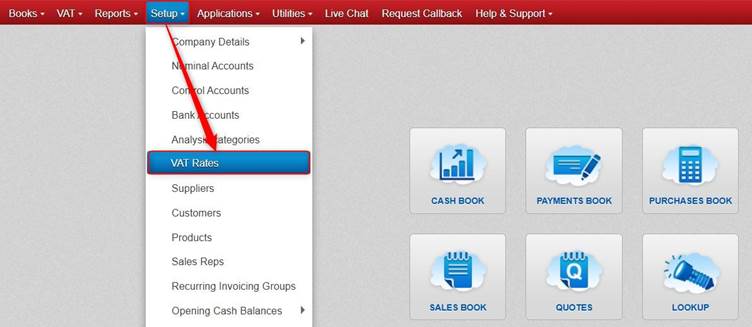 - Go to Setup (along the top of the screen) > VAT Rates > Yes.