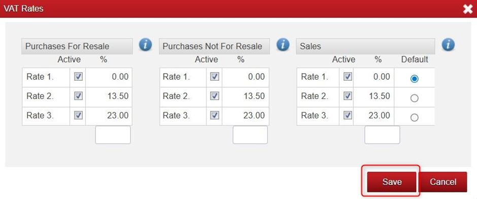 - Click Save once you have all the VAT Rates you want added to the different sections e.g. Sales, Purchases Not For Resale, Purchases For Resale etc.
