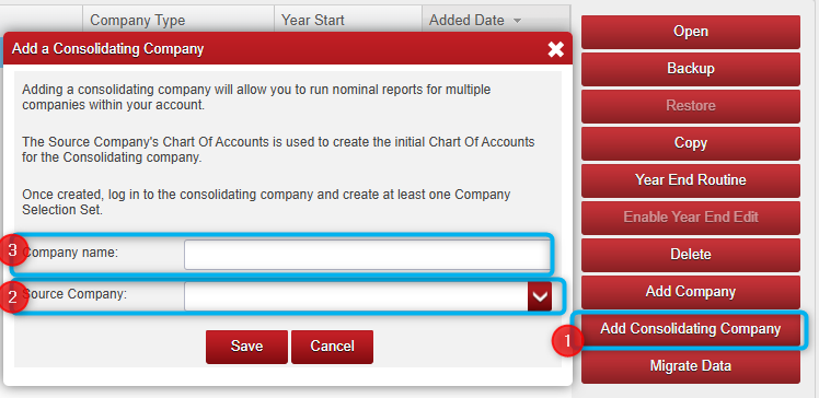 Both companies will need to share the same financial year for you to be able to use the Main Company to run any of the consolidated reports.