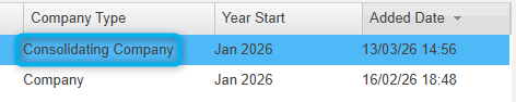 Note: When complete, the new (or child) company will show Consolidating Company under the Company Type Column.